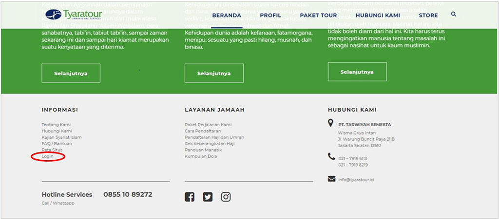 1. Kunjung website www.tyaratour.id, lalu scroll layar hingga pada bagian bawah (footer) laman website dan pilih opsi “login” dibawah menu “informasi”.