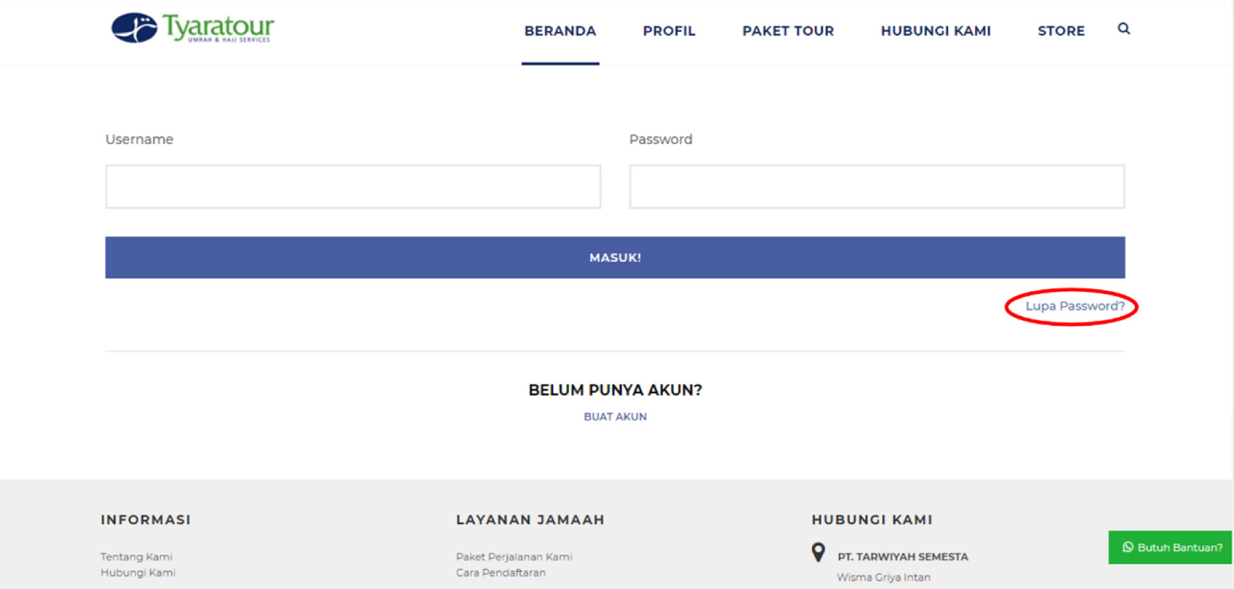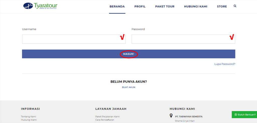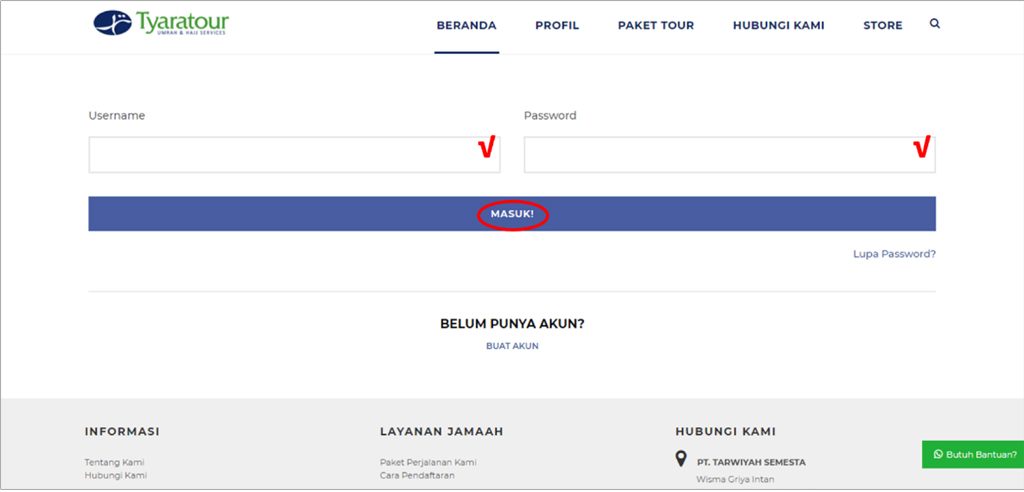 Jama’ah juga dapat mengirimkan pesan melalui website kami pada menu “hubungi kami” atau langsung memilih opsi “butuh bantuan?” pada pojok kanan layar untuk dapat langsung terhubung dengan tim kami via whatsapp.