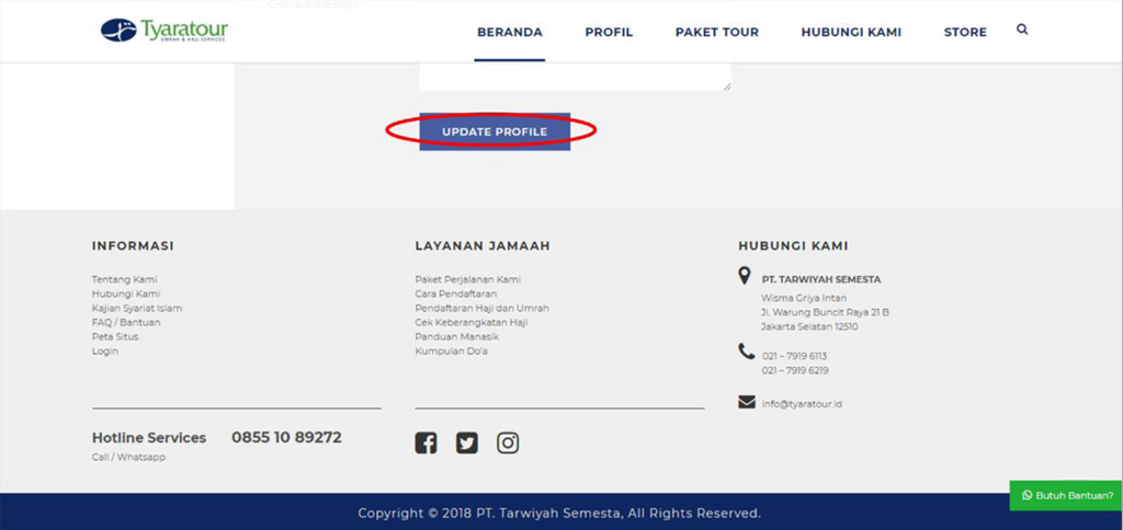 9. Apabila jama’ah membutuhkan bantuan atau pertanyaan, Tim kami siap membantu jama’ah 24/7 dengan menghubungi hotline ataupun whatsapp kami di 0855.108.9272.Kami juga dapat dihubungi melalui email di info@tyaratour.id, ataupun akun media social kami baik Facebook, Twitter, maupun Instagram di @tyaratourid.