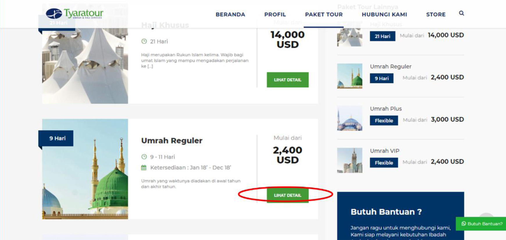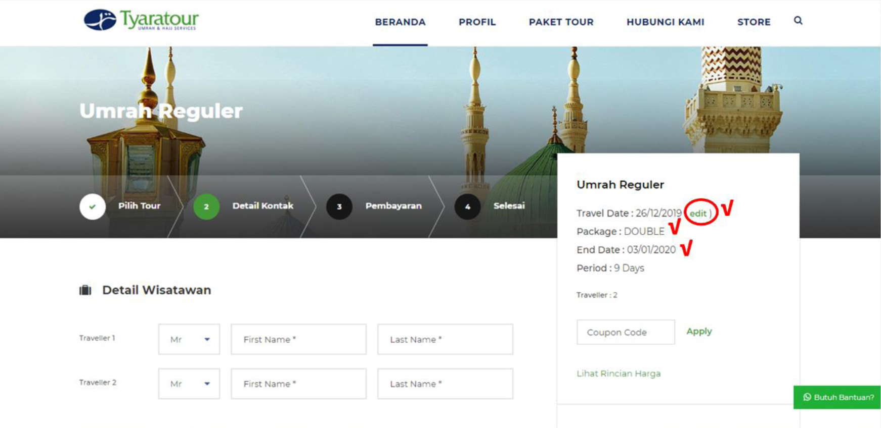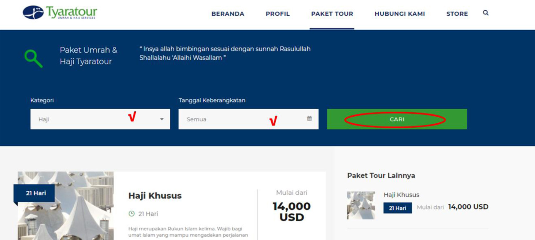 8. Setelah profile jama’ah lengkap. Jama’ah sudah dapat melakukan pendaftaran paket pada website www.tyaratour.id.