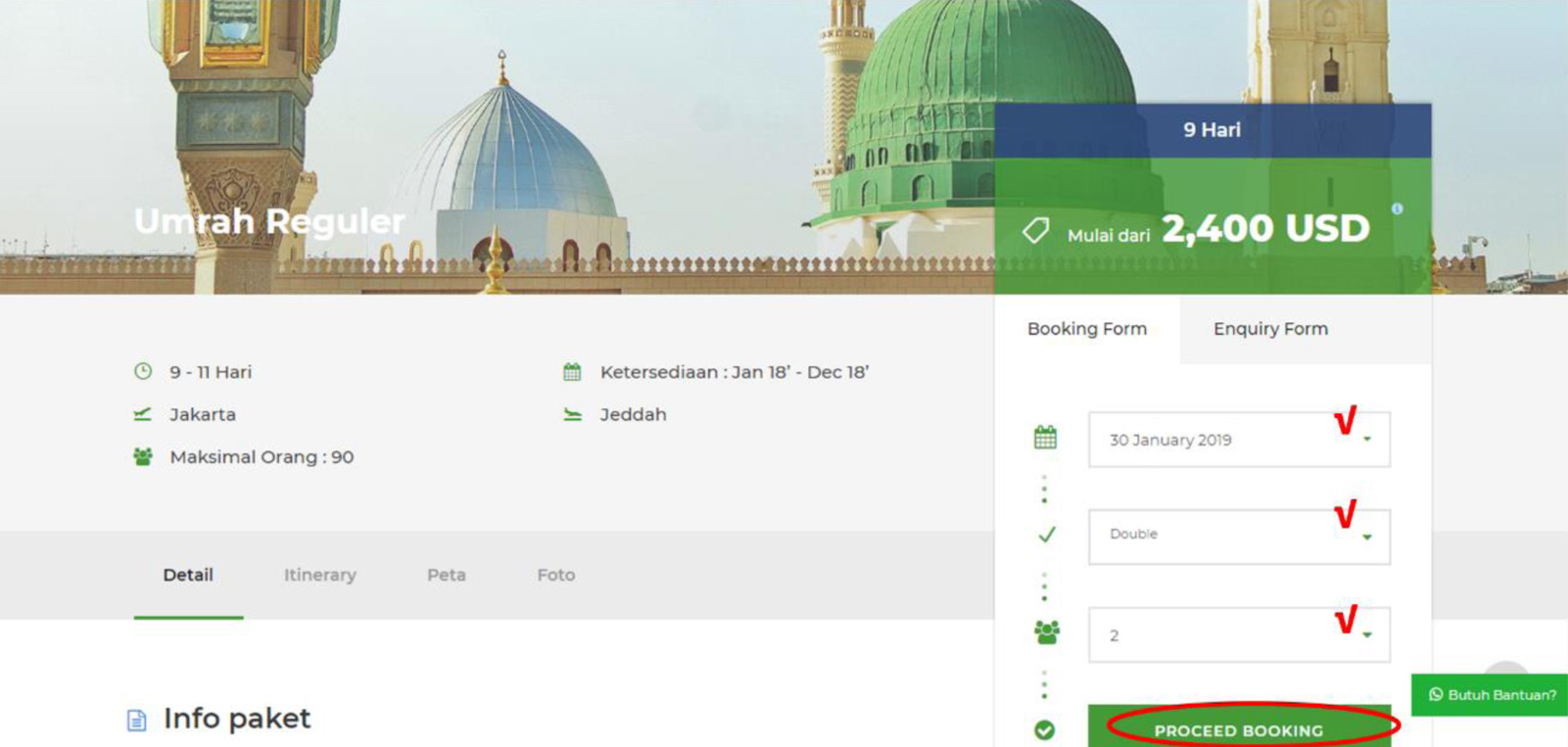 5. Pada laman ini segala informasi mengenai paket disajikan dari waktu keberangkatan, gambaran perjalanan, akomodasi serta fasilitas yang digunakan, dan lain sebagainya.Untuk melakukan booking untuk paket, jama’ah diharap untuk mengisi “booking form” pada bagian kanan layar untuk tanggal keberangkatan yang dikehendaki, jenis paket, dan jumlah jama’ah yang akan berangkat lalu tekan tombol “proceed booking”.