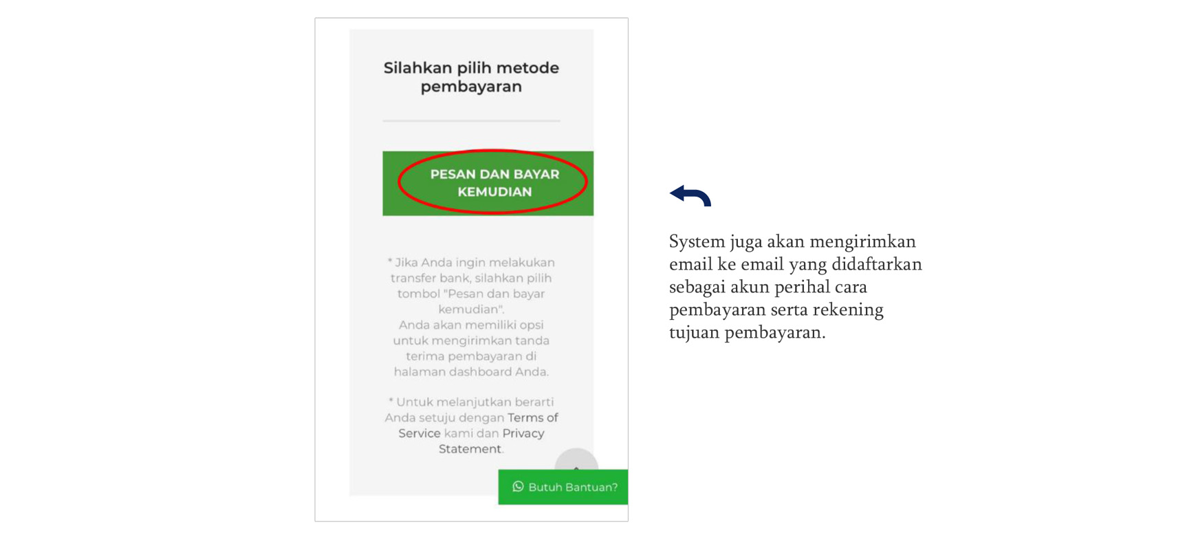 8. Setelah menekan tombol “next step”, akan tampil halaman dimana jama’ah diminta untuk melakukan konfirmasi pemesanan, memilih metode pembayaran dan petunjuk pembayaran. Perlu diperhatikan dengan menekan tombol “pesan dan bayar kemudian”, maka jama’ah setuju untuk akan “Syarat dan Ketentuan Berlaku / Terms of Service” dan “Kebijakan Privasi atau Privacy Statement” dari Tyaratour. System juga akan mengirimkan email ke email yang didaftarkan sebagai akun perihal cara pembayaran serta rekening tujuan pembayaran.