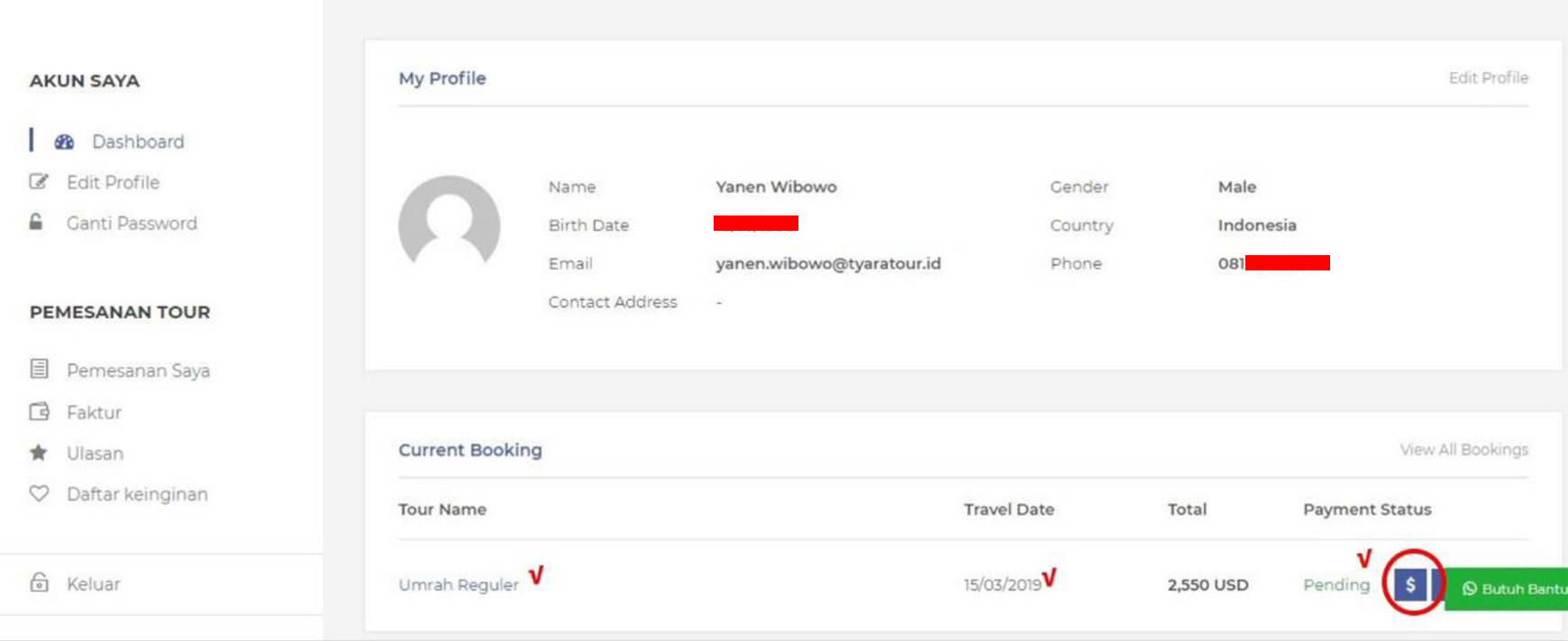 10. Pada laman “Dashboard”, jama’ah dapat melihat detail pemesanan dan memantau progress pemesanannya.Untuk mengunggah bukti pembayaran juga dapat dilakukan di laman “Dashboard” dengan menekan tombol “$”.