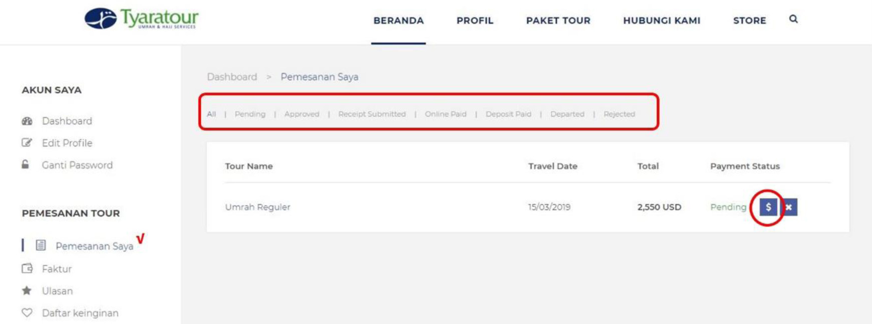 Atau dapat memilih opsi “pemesanan saya” pada menu “pemesanan tour”. Sama halnya dengan laman “Dashboard”, pada “pemesanan saya” jama’ah juga dapat memantau progress pemesanannya berdasarkan status dari pemesanannya.