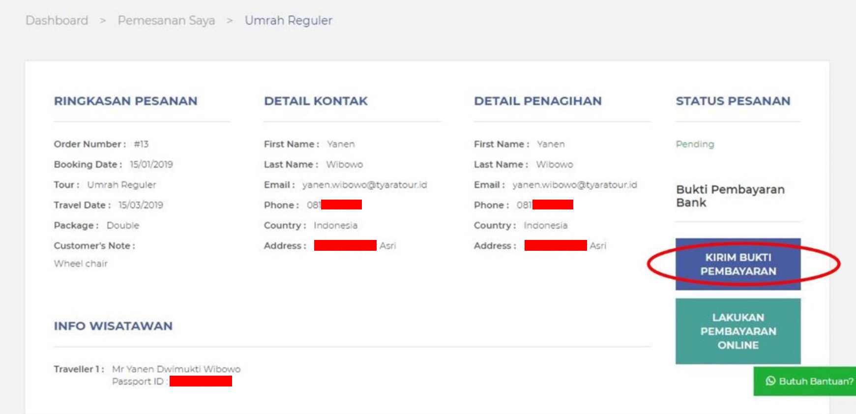 11. Setelah menekan tombol “$”, akan muncul laman yang menyediakan opsi “kirim bukti pembayaran” untuk mengkonfirmasi pemesanan paket tour yang telah dipesan.