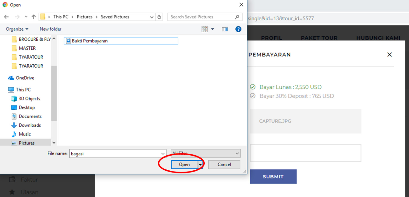 12. Setelah menekan tombol “kirim bukti bayar”, akan muncul laman dimana jama’ah dapat mengunggah bukti pembayarannya dengan menekan tombol “klik untuk memilih file”, pilih file bukti pembayaran lalu pilih opsi “open”.