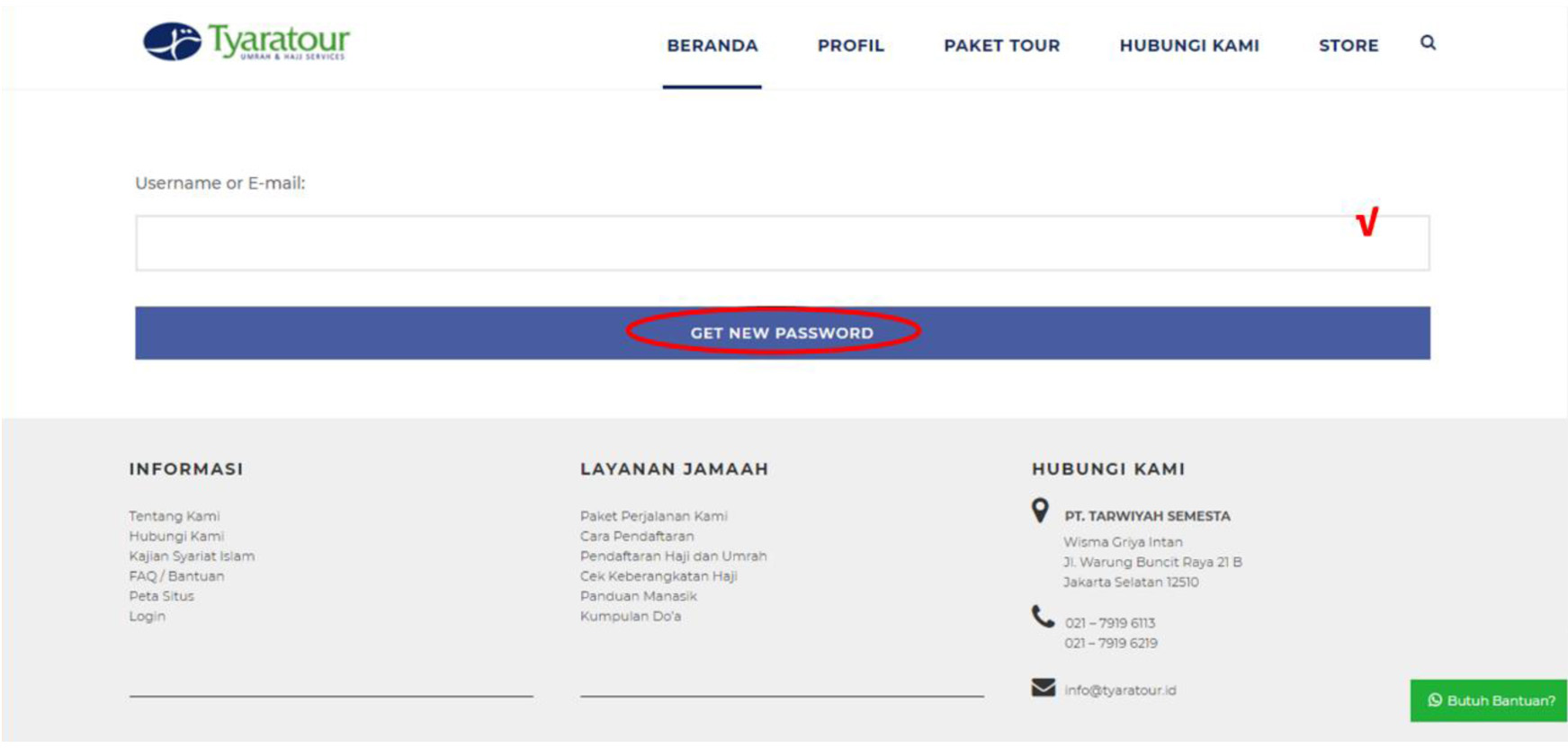 2. Akan muncul laman yang akan meminta username / alamat email dari akun yang telah didaftarkan oleh jama’ah lalu menekan tombol “get new password”.