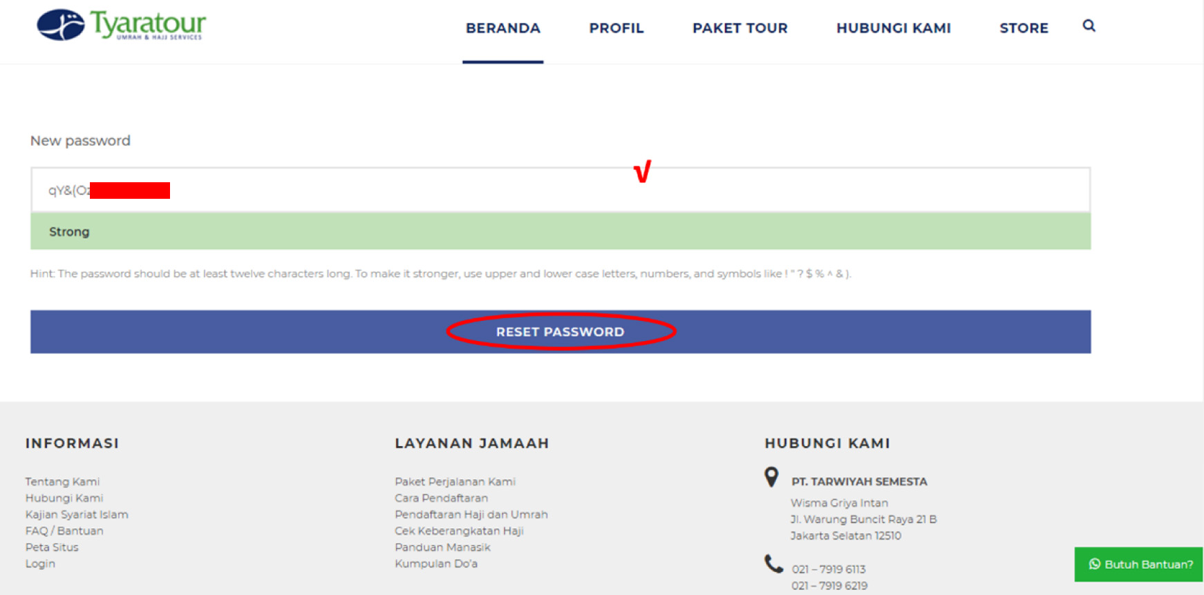 4. Setelah itu jama’ah dapat menginput password baru yang dikehendaki pada field “new password” untuk merubah password dan tekan tombol “reset password”. Setelah menekan tombol, password akun jama’ah sudah otomatis berubah menjadi password yang terbaru.