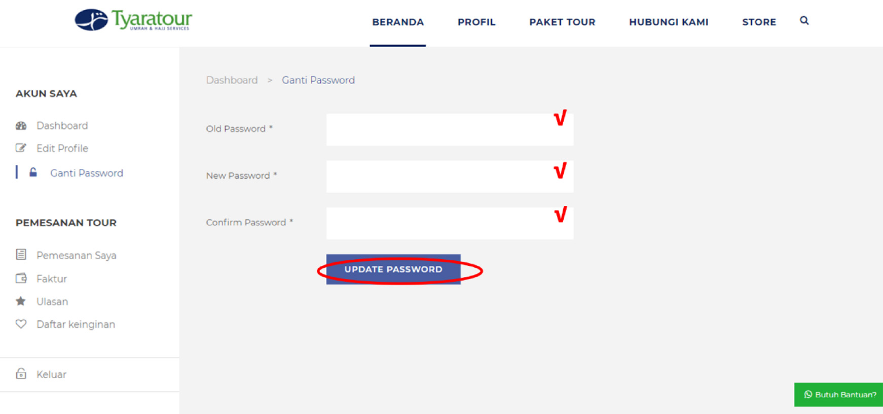 6. Setelah memilih opsi “ganti password”, untuk merubah password tersebut jama’ah diharuskan untuk menginput password lama jama’ah yang dilanjutkan menginput password baru yang dikehendaki dan memasukan kembali password baru tersebut, lalu tekan tombol “update password” untuk merubah password lama menjadi password baru.