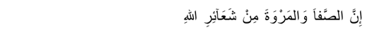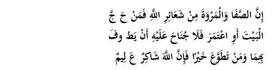 “Sesungguhnya Shafaa dan Marwa adalah sebahagian dari syi’ar Allah. Maka barangsiapa yang beribadah haji ke Baitullah atau ber‐umrah, Maka tidak ada dosa baginya mengerjakan sa’i antara keduanya. dan barangsiapa yang mengerjakan suatu kebajikan dengan kerelaan hati, Maka Sesungguhnya Allah Maha Mensyukuri kebaikan lagi Maha Mengetahui.”