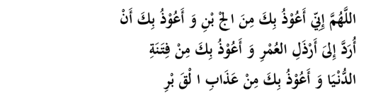 “Ya Allah sesungguhnya aku berlindung pada‐Mu dari sifat pengecut, dari dikembalikannya aku kepada umur yang paling lemah (pikun) dan fitnah dunia dan dari siksa kubur.”