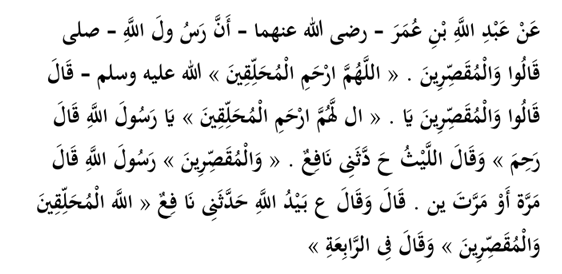 “Ya Allah berikanlah kasih sayang kepada orang‐orang yang mencukur rambutnya” Para shahabat bertanya: “Dan orang‐orang yang memendekkan rambut, wahai Rasulullah?” Rasulullah Shallallahu’Alaihi Wassalam berkata: “Ya Allah berikanlah kasih sayang kepada orang‐orang yang mencukur rambutnya” Para shahabat berkata: “Dan orang‐orang yang memendekkan rambut, wahai Rasulullah?” Rasulullah Shallallahu’Alaihi Wassalam menjawab “Lalu orang‐orang yang memendekkan rambut.” Dan telah berkata al‐Laits, telah berkata kepada‐ku (al‐Laits) Nafi’, “Ya Allah berikanlah kasih sayang kepada orang yang mencukur rambutnya”, sekali atau dua kali,(dari jalur hadits yang lain) telah berkata Ubaidillah, telah berkata kepada‐ku (Ubaidillah) Nafi’, Dan Rasulullah Shallallahu’Alaihi Wassalam berkata pada kali yang keempat “Dan bagi yang memendekkan rambut”