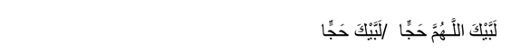 “Aku sambut panggilan‐Mu, ya Allah, aku sambut panggilan‐Mu. Aku sambut panggilan‐Mu, tiada sekutu bagi‐Mu, aku sambut panggilan‐Mu. Sesungguhnya segala puji, kenikmatan dan kerajaan adalah milik‐Mu, tiada sekutu bagi‐Mu.”
