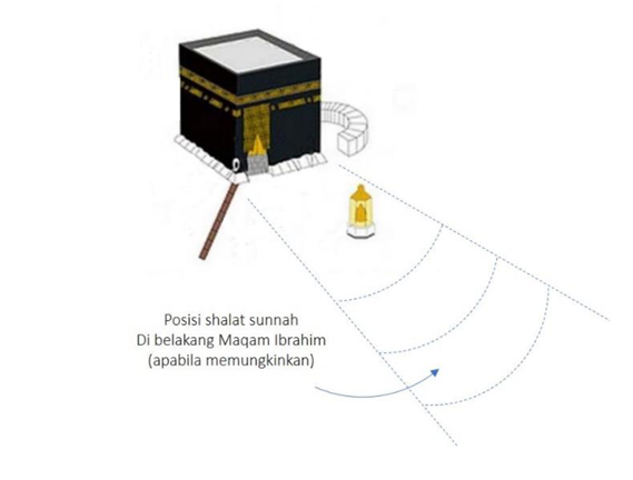 Sesampainya di Maqam Ibrahim, Lakukan shalat sunnah 2 raka’at tepat di belakang Maqam Ibrahim (apabila memungkinkan, namun jika tempat tersebut dipenuhi oleh orang-orang yang melakukan thawaf ataupun shalat, maka shalatlah di mana saja jama’ah mendapat tempat di Masjidil Haram).